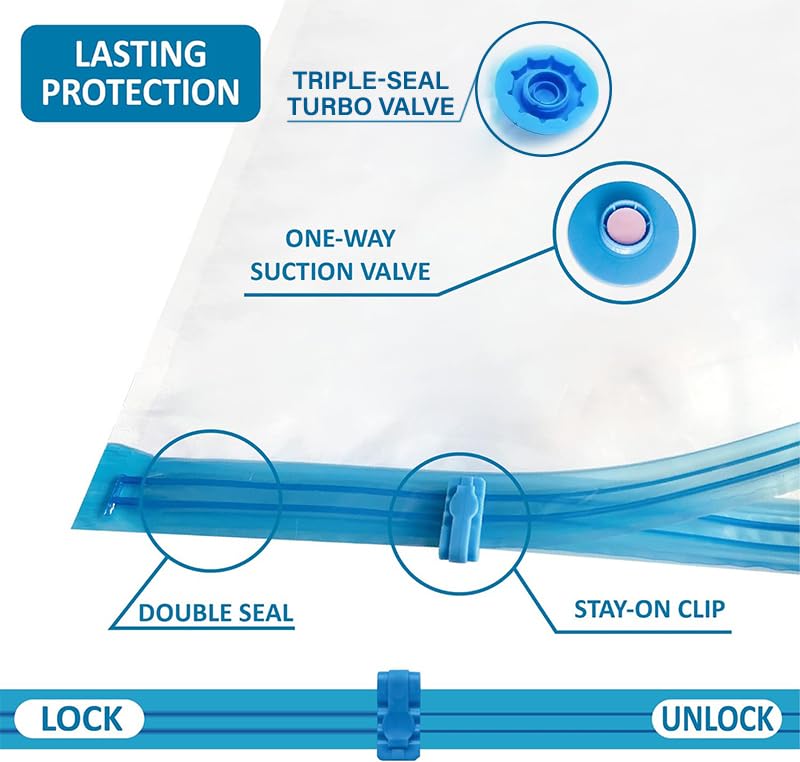 - MATERIAL: Made of Polyamide Polyethylene, the air vacuum packing bags ensure the safety of stored items with a robust and reliable design. The triple-seal formula provides double security, preventing any air from passing through. Designed to be free of any microbial action, these bags effectively block odors, water droplets, mildew, and insects/bugs. The textured seal offers a non-slip grip, making the bags easy to handle and secure.